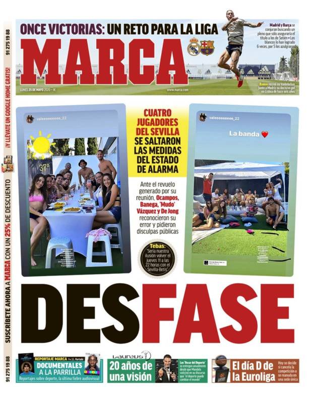 En lo que nada ha cambiado de antes del Covid a ahora es que Banega sigue metido en todos los fregaos extradeportivos Es un perejil de todas las salsas, con independencia de que a esta última salsa le sobren por lo menos un par de ingredientes. En esta fase de la desescalada no se puede exceder de diez personas por reunión, y varios jugadores del Sevilla se han mostrado un fiestuqui demasiado multitudinario y encima lo han colgado en Instagram. Les ha faltado ponerlo en twitter mencionando la cuenta de la Guardia Civil y la de Salvador Illa (Illa Illa, Juanito Maravilla). Y es lo que antes decíamos: en este caso no importa la naturaleza de los fungibles consumidos ni la virtud de las acompañantes, que no dudamos es intachable. Lo que cuenta es que había demasiada gente ahí conforme a la ley de salida del desconfinamiento. Los chicos ya se han disculpado pero a Marca le ha faltado tiempo para ponerles una portada ejemplarizante. El juego de palabras (“desFASE”) estaba servido, aunque no tiene ninguna pinta de desfase como tal el ágape: sol, carpa, bebidas fresquitas, mucha niña mona pero ninguna sola (como decía Mecano) y un ambiente que a priori se antoja de lo más sano. Pero claro, eran más de diez, y eso no puede ser.