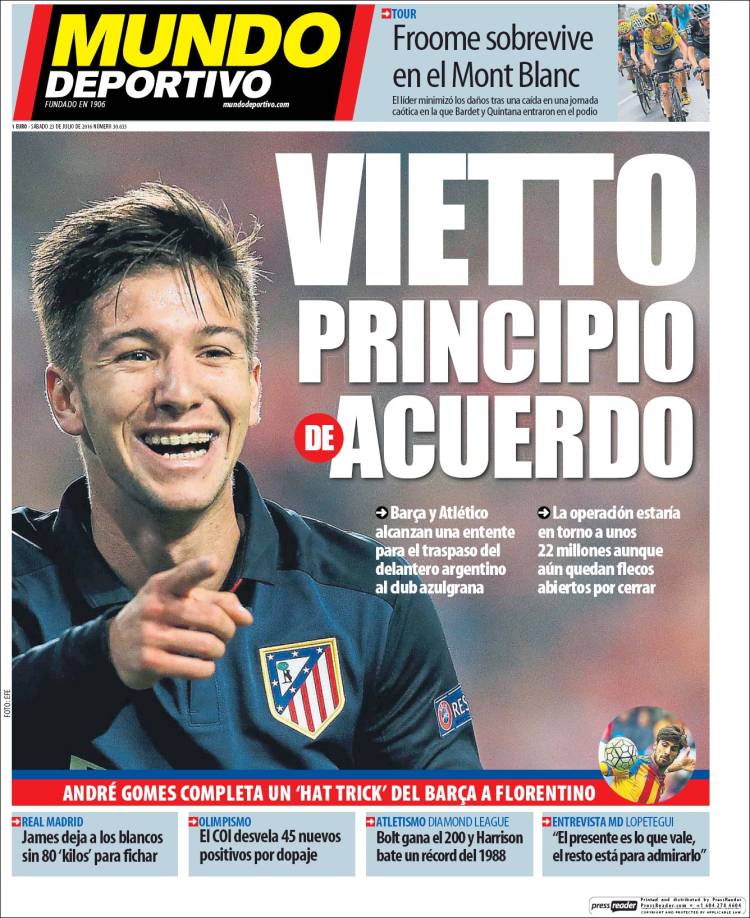 Mundo Deportivo Portada Vietto 23.07.16Sport Portada Florentino 23.07.16Viettos apartes, Mundo Deportivo habla de no sabemos qué "hat trick del Barça a Florentino" tras el fichaje de André Gomes (al que se refiere este artículo de Ramón Álvarez de Mon). Todo el Barça contra Florentino nos parece un duelo demasiado desigual, la verdad. Y ya no solo por el poder ancestral y alquímico del tiki-taka, sino porque ya nos dirán ustedes cómo puede el presidente del Madrid hacer a la vez de delantero, de centrocampista, de defensa y hasta de portero sin recibir una goleada de escándalo. Bien pensado, volver a casa tan solo con un hat-trick en semejantes circunstancias nos parece un milagro y hasta un demérito para el més que un club. Ni siendo verdad que Florentino es un ser superior, se entiende que solo le caigan tres goles en partido tan loco. Se ve que en Barcelona no quieren hacer astillas del árbol caído. Son buena gente, son magnánimos en su grandeza.