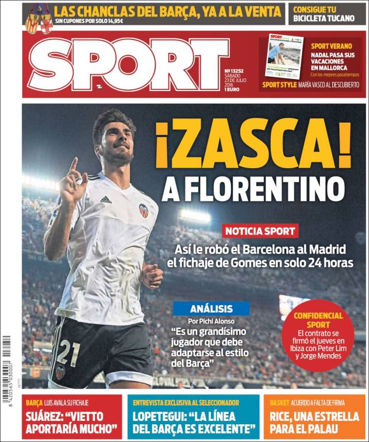 Pero cuando la sonrisa ya se dibuja en nuestros labios, saltamos a Sport y la cosa torna carcajada incontrolable. No tiene desperdicio la portada de nuestros amics. Qué primor, qué deleite, qué soltura... qué pena, qué risa. El fichaje de André Gomes -quien se ve que es el nuevo Maradona, como antes lo fueron Alex Song, Douglas o mucho antes Saviola- ha desatado a Sport, pero no tanto por lo que pueda ofrecer en el Camp Nou el ex del Valencia (donde la sombra de Mijatovic es alargada), sino por lo que el portugués no ofrecerá en el Bernabéu. Ojo aquí, que lo importante no es haber contratado a un jugador, sino habérselo robado (literal) al Madrid, robo que se asume como cierto para gloria del periodismo de aseveración apresurada, ese que tanto abunda y que tantos balones deja botando -ya lo decíamos- a esta sección portanalítica. "Chincha rabiña", le falta poner a Sport en su portada de hoy.