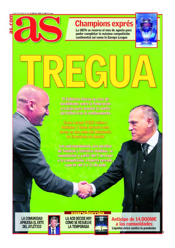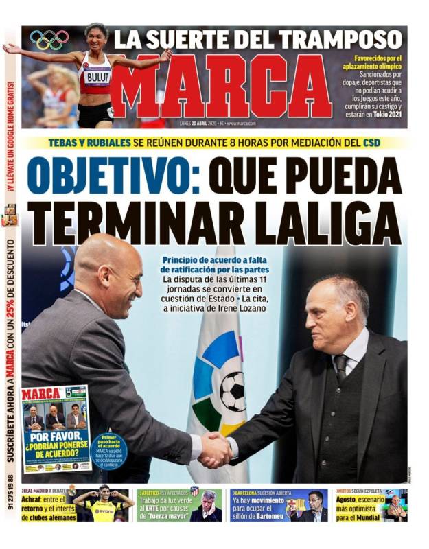 As ha cogido una foto de cuando no solo la gente se daba la mano sin temor a contagiarse nada, sino de cuando Tebas y Rubiales se daban la mano sin temor a acabar haciendo con ella un puño, de lo cual hace todavía más tiempo. The Ouija On Acid Daily ha cogido esa foto y la ha puesto sobre un fondo verde de esos que se usan en los platós de televisión para que luego el realizador ponga en fondo apetecido de manera artificial. Nos cuentan que la técnica se llama chroma key. Así, en buena lid, el lector convertido en realizador televisivo podría poner el fondo que estimara oportuno para esta escena: un desierto de western crepuscular, un ring de boxeo, un table dance. Marca tiene el mal gusto hoy de despreciar las capacidades de nuestra imaginación y poner el fondo por nosotros.