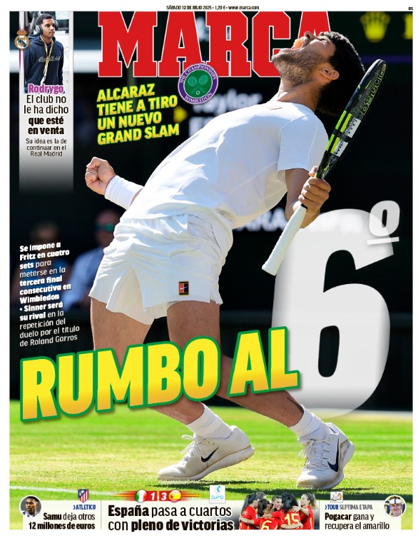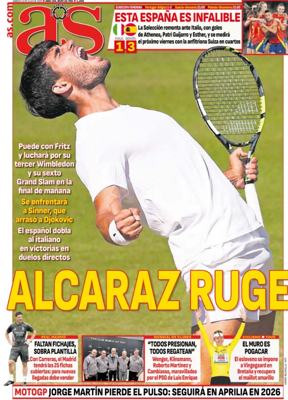 Las portadas de hoy se dedican casi en exclusiva a Carlitos Alcaraz, quien ayer avanzó a una nueva final de Wimbledon, la tercera consecutiva. Y Carlitos es tan madridista que, cuando llega a una final, es para ganarla y llevarse el título. Podría ser su sexto Grand Slam en la sexta final, una infalibilidad que nos recuerda que nada luce tan hermoso como el blanco absoluto sobre el verde del césped.