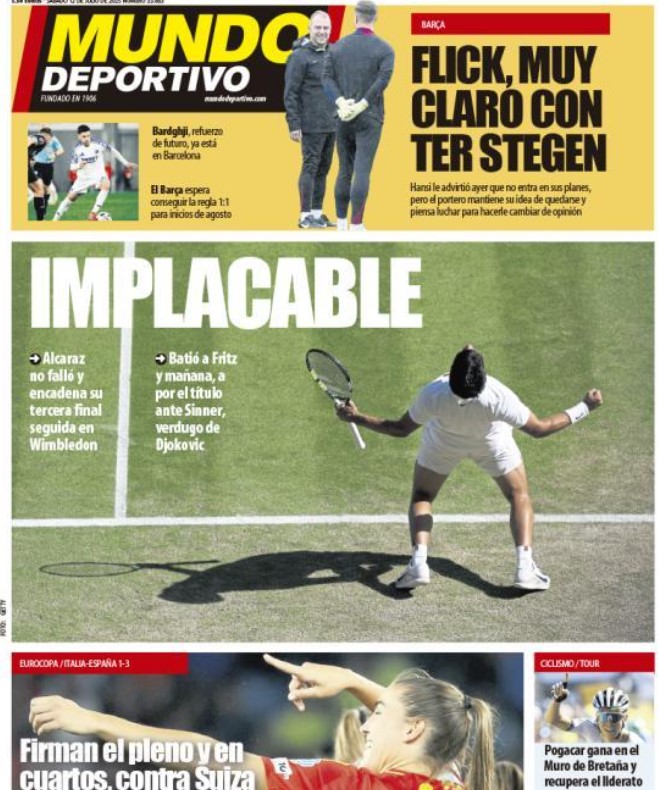 Y mientras Pogacar se vuelve a vestir de amarillo, Ter Stegen sabe que tendrá que hacerlo en otros lares. En otro pequeño recuadro aparece la noticia del fichaje del lateral Carreras por el Real Madrid. Bienvenido sea, sus ídem serán muy apreciadas en un equipo que necesita reforzarse.