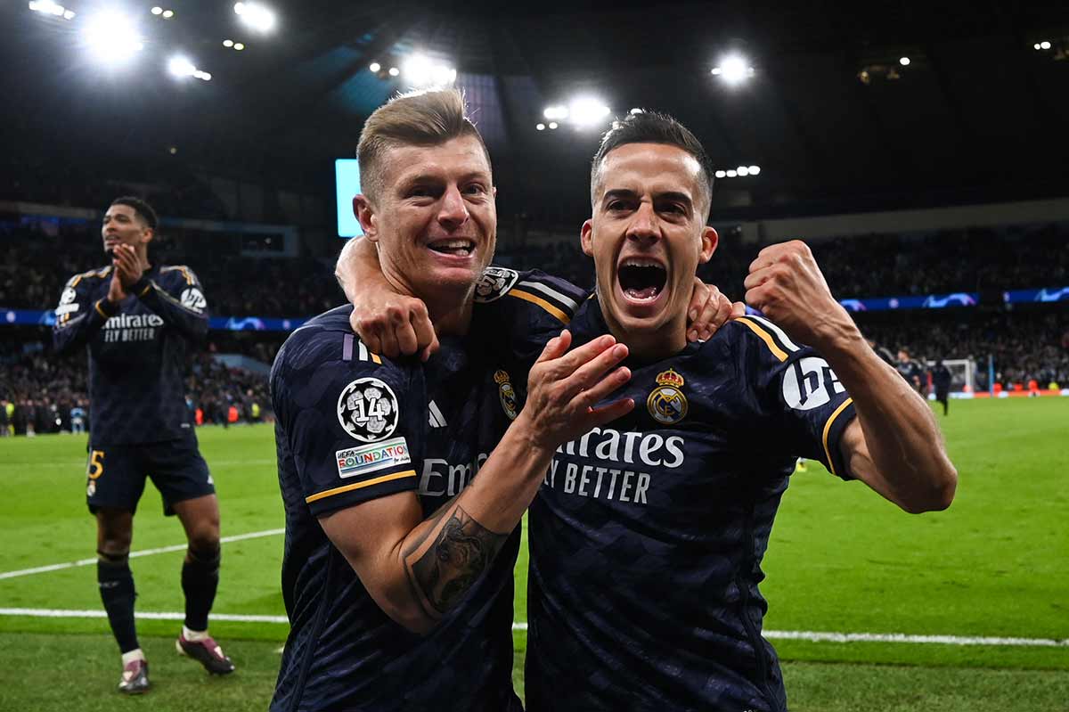 El 17 de abril de 2024 será recordado como la fecha en la que el Real Madrid escribió otra página de oro (y van…) en la competición más importante del mundo. Etihad Stadium. Manchester (Inglaterra). Vuelta de los cuartos de final de la edición en curso. Manchester City-R. Madrid o, lo que es lo mismo, Campeón de Europa vs Rey de Europa. No hubo encerrona, no hubo cosas raras. Lo que hubo fue un monumental equipo que se volcó con todo lo habido y por haber sobre la portería de Lunin, que luchó sin cesar materializando casi cuarenta disparos a portería y casi veinte saques de esquina, que ahogó literalmente al rival dentro de su área pequeña, que se entregó hasta la extenuación para derribar el muro tejido por el equipo contrario y, enfrente, simplemente, el Real Madrid de la Copa de Europa.