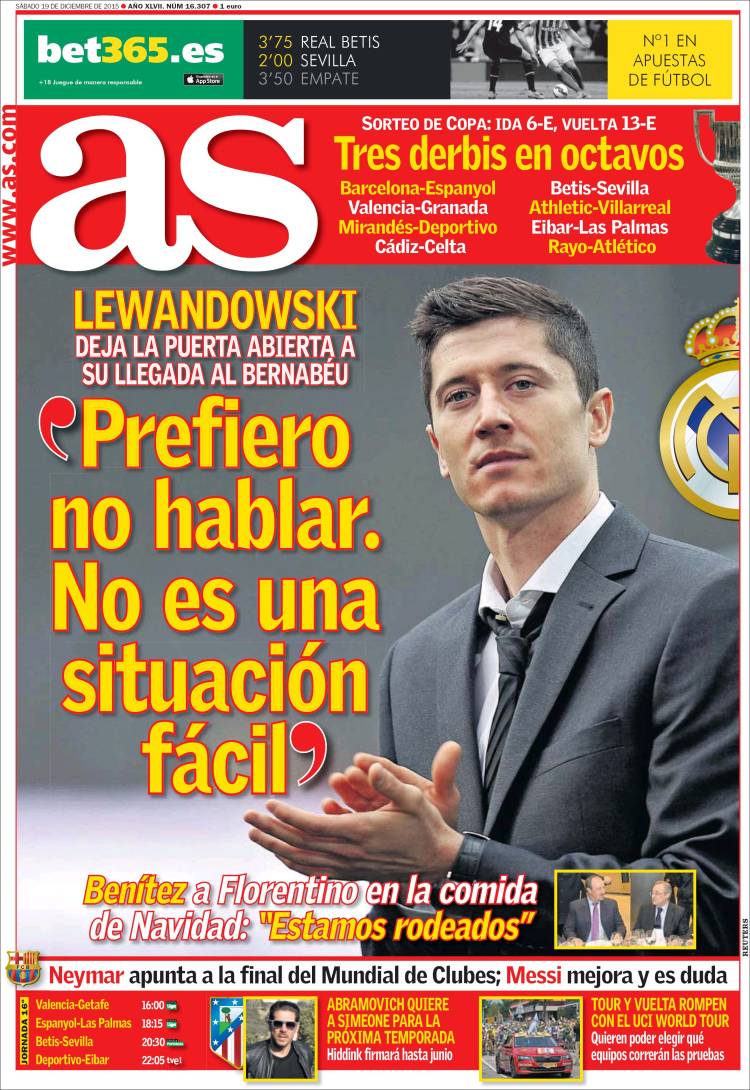 También As nos ofrece una nota sobre la comida de Navidad del Madrid, pero es apenas un detalle, si bien nos parece bastante significativo. No sabemos si el entrecomillado que pone As en boca de Benítez es cierto o no, pero la frase en cuestión -estamos rodeados- nos parece fuera de toda duda. Una verdad como un templo, vamos. En estas condiciones, en medio del fragor de una batalla que no cesa, resulta muy difícil mantener la calma necesaria para eso que suele llamarse trabajar y que suele dar resultados a medio y largo plazo, si es que eso del medio y el largo plazo es aún posible en el fragor recién citado (que se lo digan a Bale). Mucho nos tememos que no, y que el propio club, en todos sus estamentos, se ve tan obligado a responder al fuego cruzado que debe de hacérsele muy complicado centrarse en los queharecer cotidianos, sobre todo cuando cada uno de esos quehaceres es cuestionado, criticado, sacado a la palestra y puesto en tela de juicio.