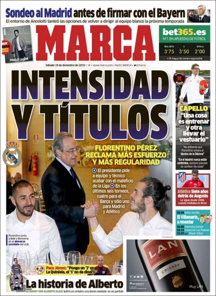 Ocurre, sin embargo, que la parcialización gráfica que de la realidad de esa petición hace hoy Marca da a entender -decíamos que sutilmente, pero lo poníamos entre comillas- que el recado va sobre todo para Bale. Ya saben: el herniado, el jugador más caro, el que no sabe asociarse, el que no encaja en los esquemas, la quintaesencia del derroche improductivo... Si miramos la foto en unión con el titular -y no otra cosa es una portada- pareciera que Florentino hubiera soltado su reprimenda o arenga justo al saludar a Bale, mirándole a los ojos y, tal vez lo que es peor, obteniendo una sonrisa como respuesta por parte del jugador de Cardiff. Nosotros no estuvimos allí, pero estamos seguros de que así no tuvieron lugar los hechos, así que ¿por qué dar a entender que así ocurrió la noticia? En fin. Qué les vamos a contar que ustedes ya no sepan, queridos galernautas.