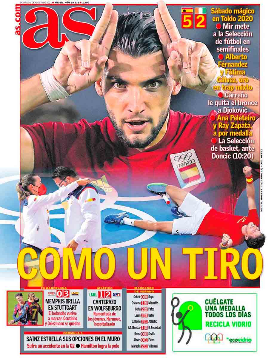 “Como un tiro” estuvo Rafa Mir, o como un toro, por su gesto. La parte central de la portada se dedica al fútbol y resta protagonismo a los medallistas Gálvez, Fernández y Carreño, pero sabemos que esto ha sido así siempre. Resulta imposible evitar la sensación de Portanálisis caducado, antiguo, ya obsoleto antes de finalizarlo. Las portadas hablan del España-Eslovenia de baloncesto, y cuando ustedes lean esto, los nuestros se estarán enfrentando a “nuestro no menos nuestro” Luka Doncic. O tendremos la alegría de nuevas medallas con las participaciones de Ana Peleteiro y Ray Zapata, pero eso ya lo sabrán por otros medios que no serán este.