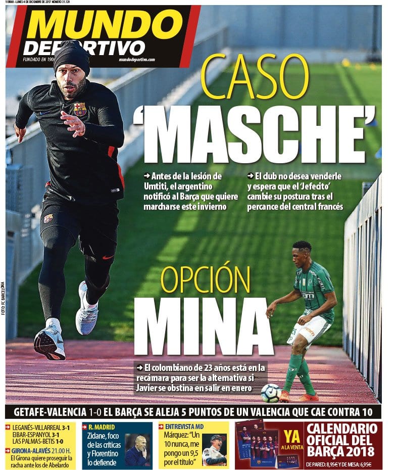 Por último, en 'Mundo Deportivo', guiño a Penalcherano, al que hay que intentar rescatar debido a la lesión de Umtiti -dos meses de baja-. El Barcelona necesita al argentino y nosotros también, ya que queremos ver si es capaz de finalizar su etapa en el Camp Nou sin que le señalen una pena máxima.
