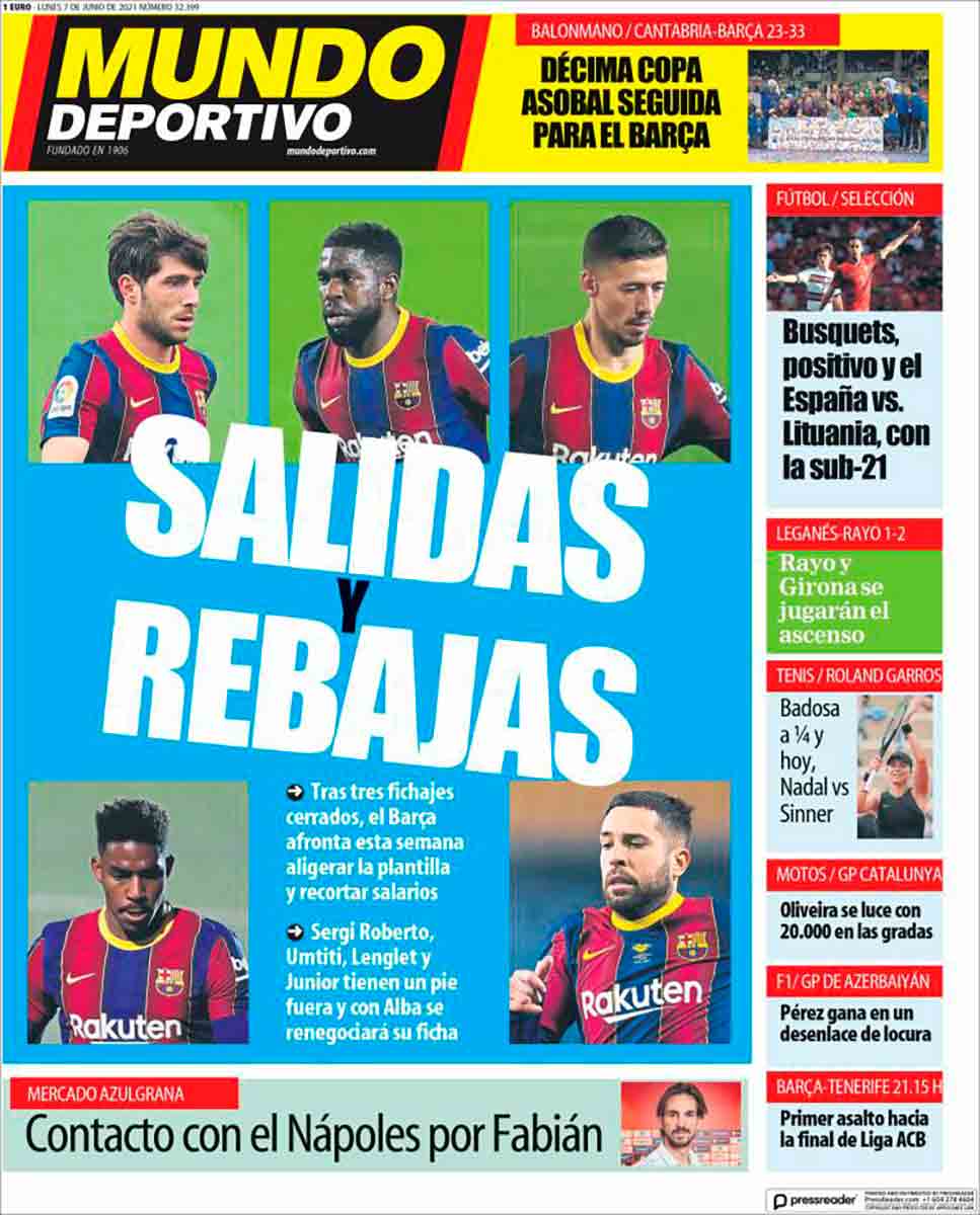En Barcelona, entretanto, andan tratando de deshacerse de los muebles viejos. Si las fotos que han puesto en Wallapop son las mismas que trae a portada Mundo Deportivo, no les auguramos un gran éxito. Tiene su mérito haber encontrado cuatro fotos de Sergi Roberto, Lenglet, Junior Firpo y Jordi Alba mirando al suelo en todas ellas, en un gesto de postración que denota la imagen de unos losers de manual. Nosotros desde luego, con estas fotos, no los comprábamos.
