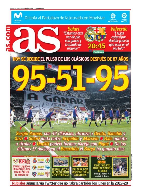 Hoy el día acabará 96-51-95, 95-52-95 o 95-51-96. Eso es lo que viene a contarnos 'La Ouija Today'. Que sepa dicho medio de comunicación que al madridismo le da absolutamente igual esa estadística. Lo que queremos es ganar porque ese verbo es nuestra religión, el motor de nuestra fe, y porque, oye, la Liga está imposible, o eso dicen, pero sumando tres puntos hoy podríamos poner un "casi" justo antes de esa palabra tan fea. Empezar marzo agitando el campeonato doméstico sería fabuloso.