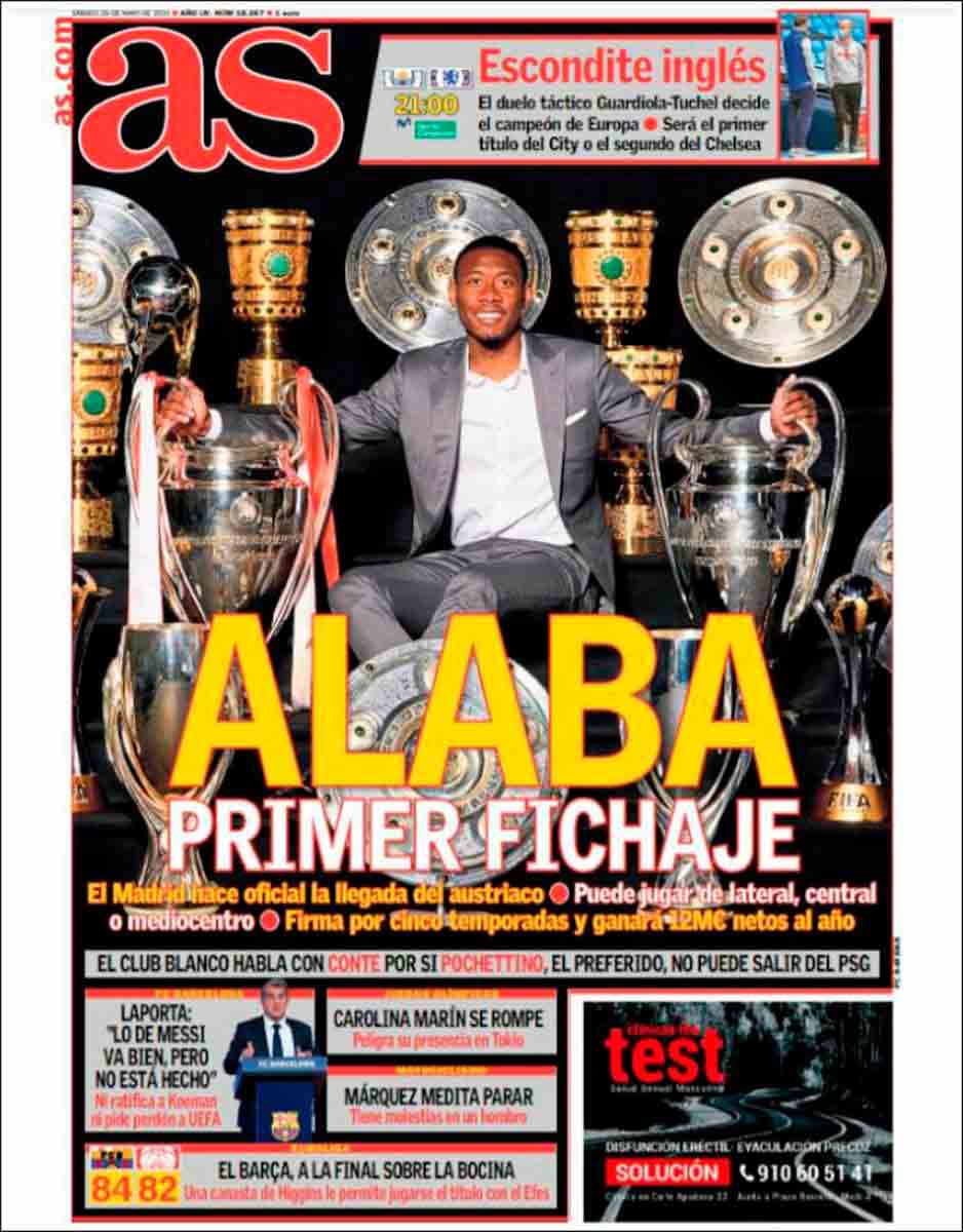 Vuelve Alaba en la portada de As. No podía ser de otro modo, ya que As es un periódico madridista, como también todos sabéis. En esta ocasión nos lo presentan (a Alaba) como si fuera un rey africano, con todo ese oro alrededor. Hubiera quedado bien algún elefante de fondo o un guepardo con collar a su lado, pero no le vamos a dar nosotros a As lecciones de estilismo. No faltaría As.