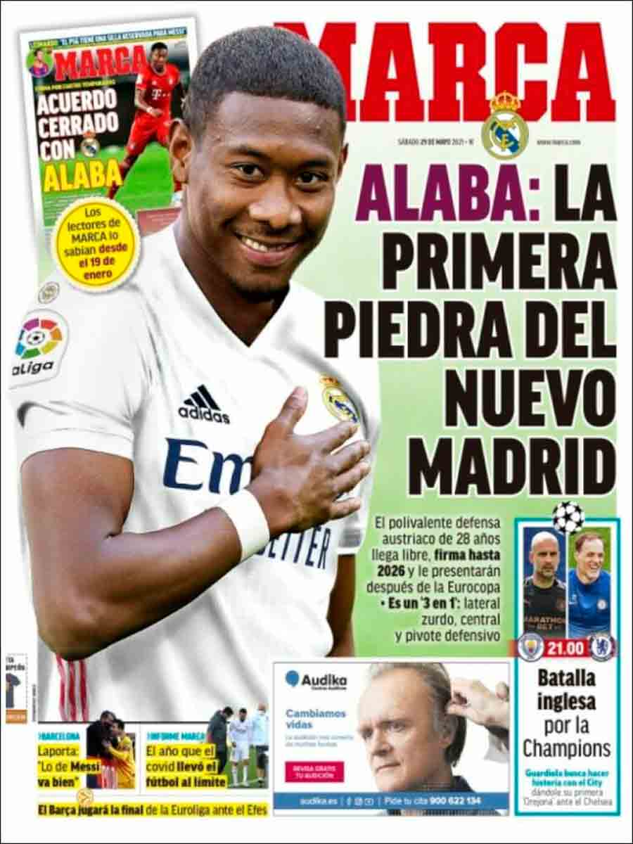 Bueno, que Alaba ya está aquí en nuestro domicilio y vamos a ver. Y no olviden que los lectores de Marca ya lo sabían desde el 19 de enero y que es polivalente. Por si no se había dicho nunca. “Batalla inglesa por la Champions” es un chiste que Marca nos trae precisamente el día de la final de la Champions entre el Manchester City y el Chelsea. Es cierto que Manchester es una ciudad de Inglaterra y Chelsea un barrio de Londres, pero esto es casi todo lo inglés que podemos encontrar en ambos equipos sustentados por ilimitados capitales extranjeros de los que ya sabéis (como bien sabe Ceferino, por supuesto) su proveniencia.