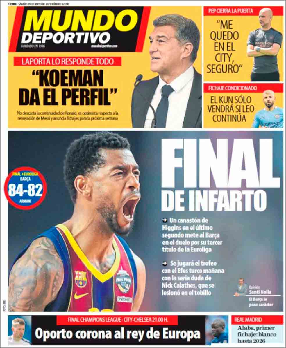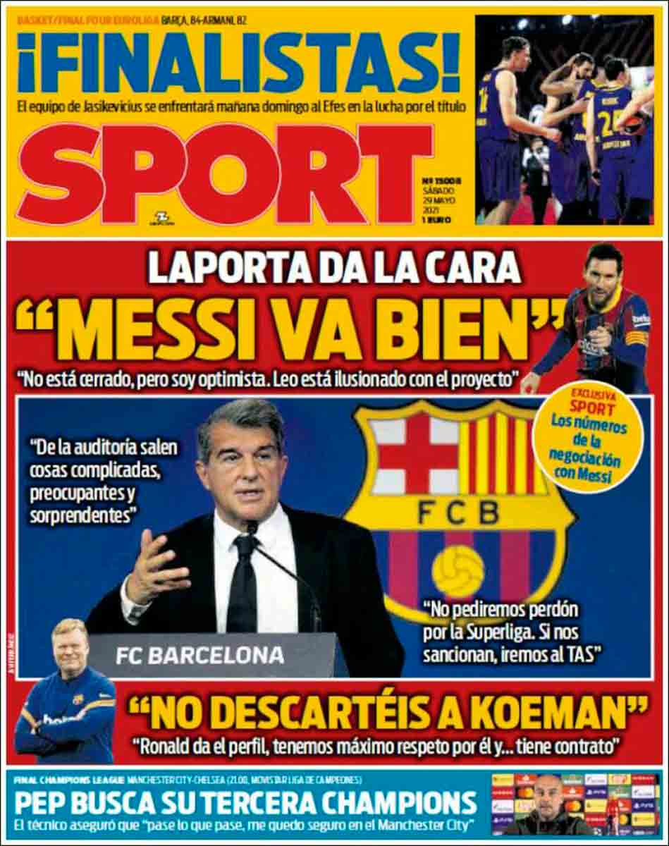 Lo contentos que están en Sport con su final de baloncesto. No es para menos, y más con el clímax de Higgins. Pero lo importante es el fútbol, con Laporta diciendo que sí, pero no. Ese LAPORTA DA LA CARA podría ser LA PORTADA LA CARA. Que puede ser esto y lo otro. Que “lo de Messi va bien”, pero no se sabe. Que a lo mejor pintan la habitación de azul o a lo mejor la pintan de grana. Que a lo mejor Koeman se queda o no, o que “de la auditoría salen cosas complicadas, preocupantes y sorprendentes”. Vamos, un cúmulo de certezas que al lector de Sport deben de haberle dejado muy tranquilo.