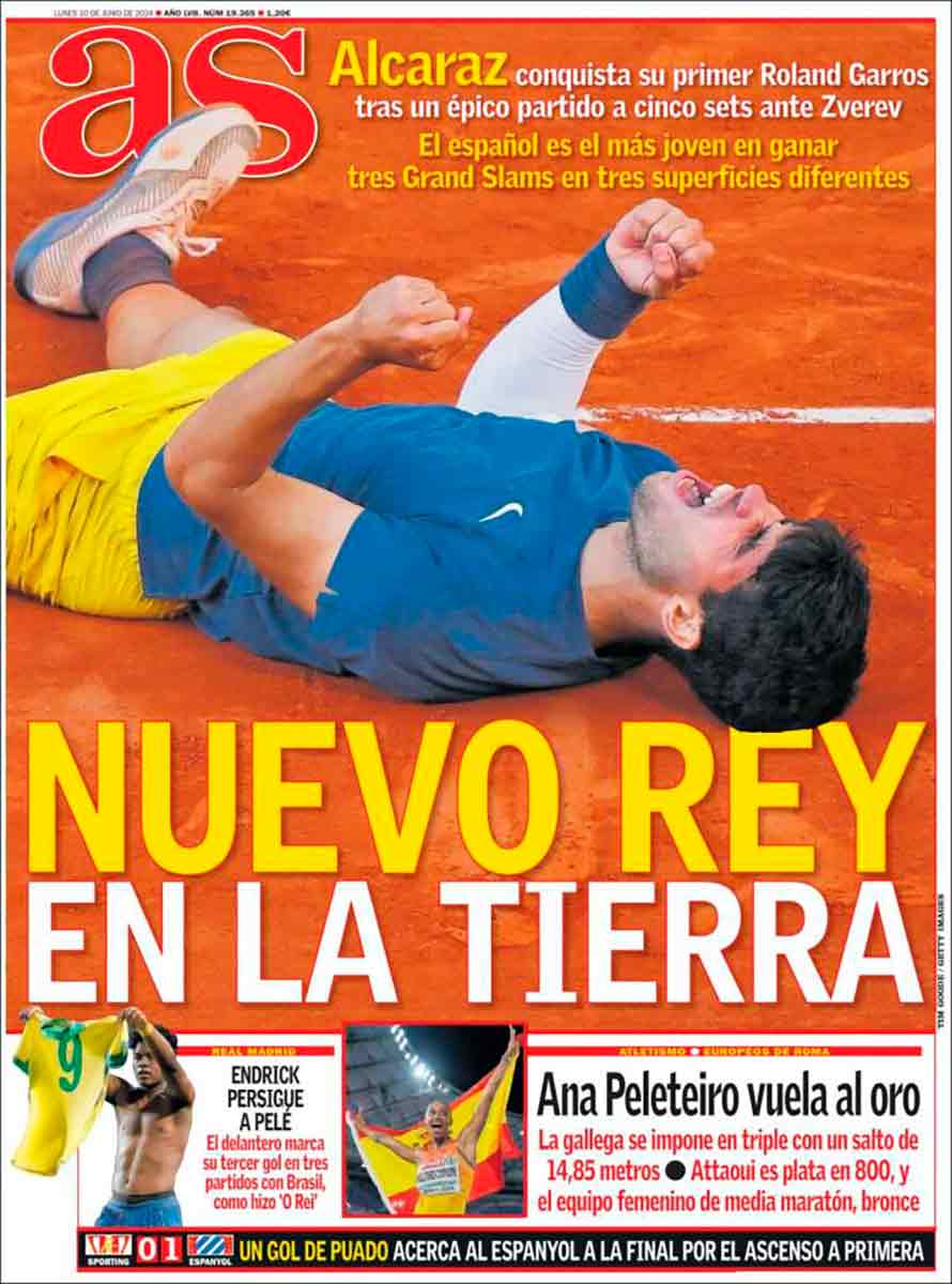 Se trata, como bien indica As, del tenista más joven que logra tres Grand Slams en tres superficies distintas. Ayer incorporó la tierra a esta lista, en el escenario más prestigioso del planeta. Los juegos de palabras como el del diario deportivo de PRISA ("Rey en la tierra"), con sus aires mesiánicos, están a la orden del día, nunca mejor dicho.