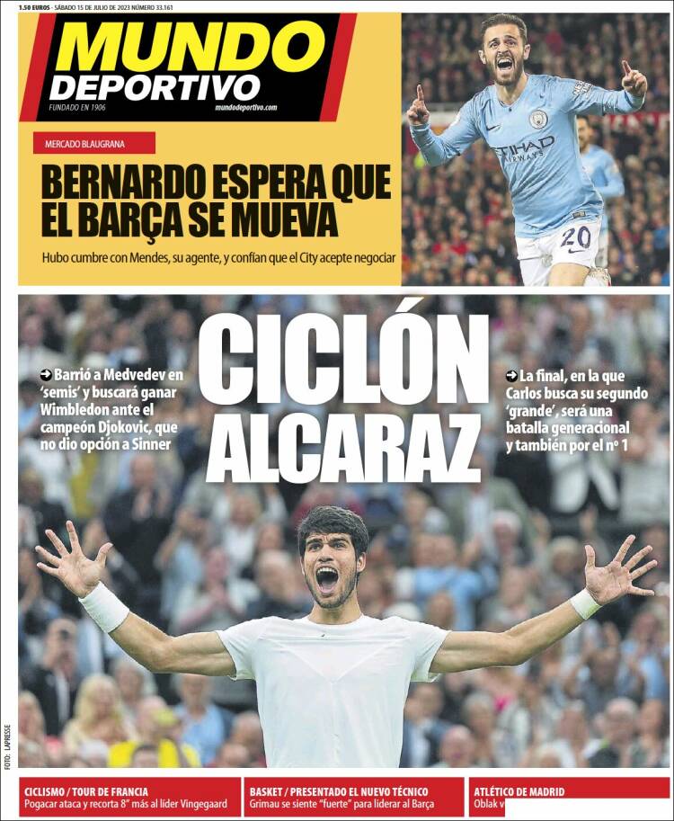 Espectacular foto en la portada del Mundo Deportivo: “Ciclón Alcaraz”. Y un titular incompleto en la parte superior: “Bernardo espera que el Barça se mueva… en los despachos”. Que es donde suele hacerlo para firmar palancas que computan, pero no se cobran, o modificar las normas de control financiero de LaLiga. Y terminamos con el diario Sport, el único que no lleva a Carlitos Alcaraz a la noticia principal del día.