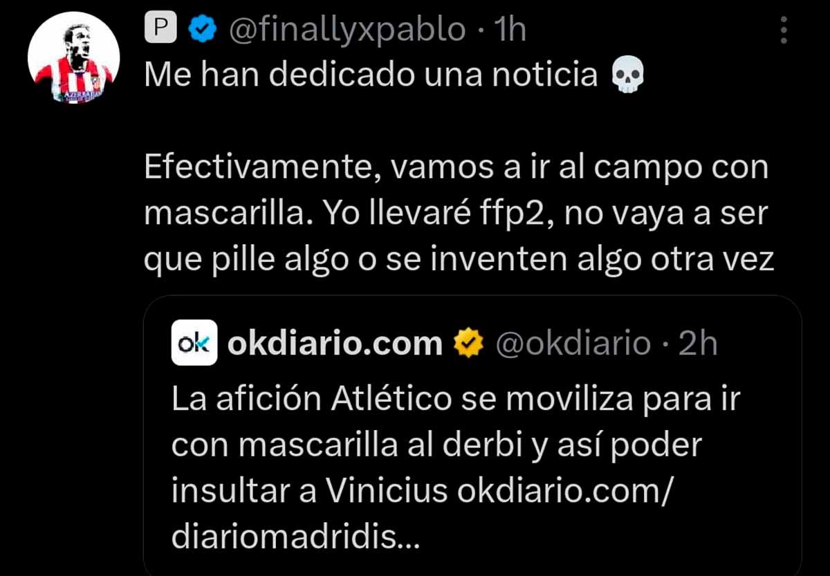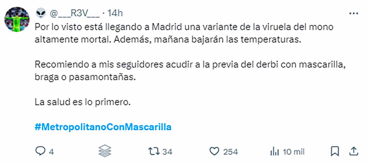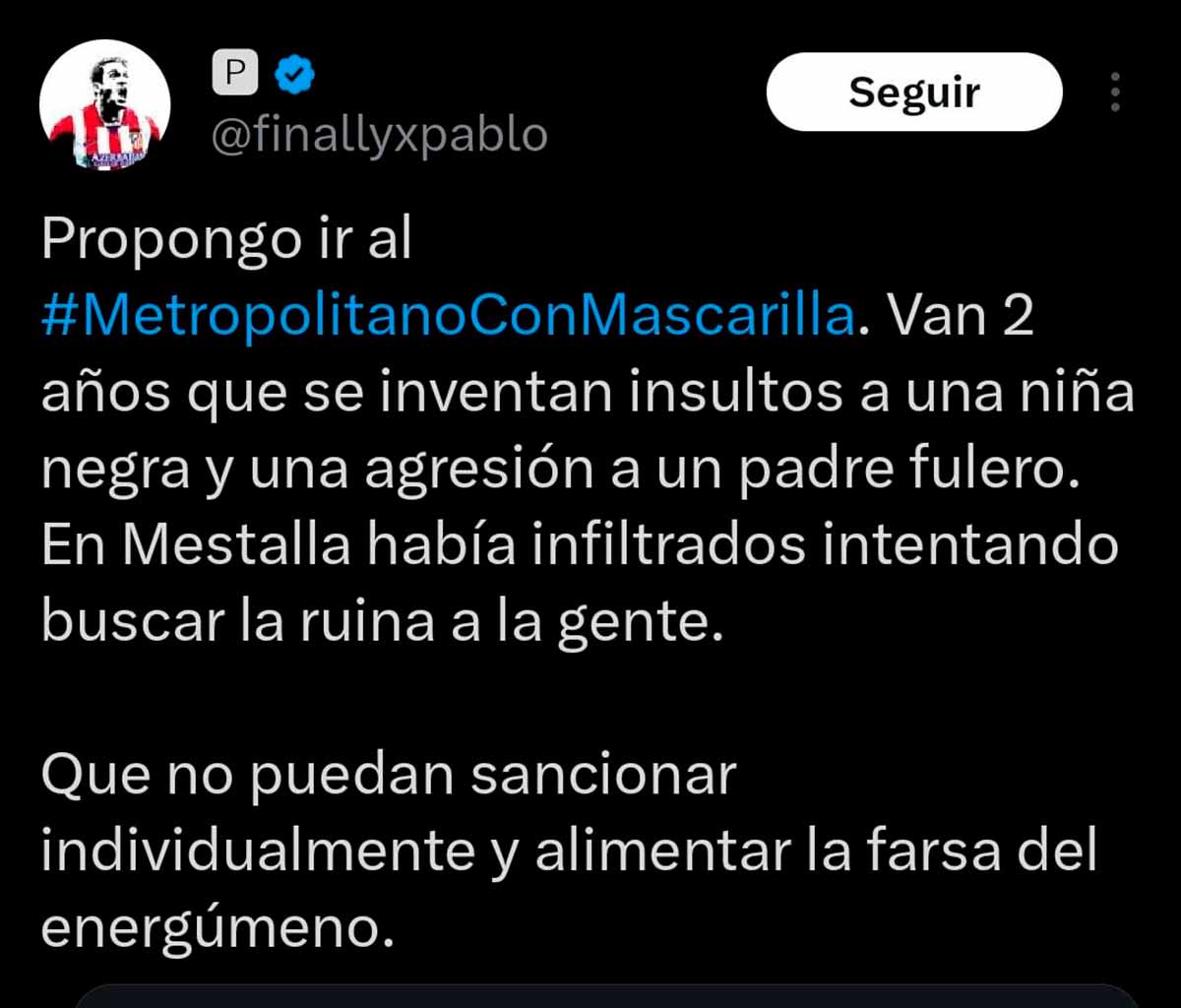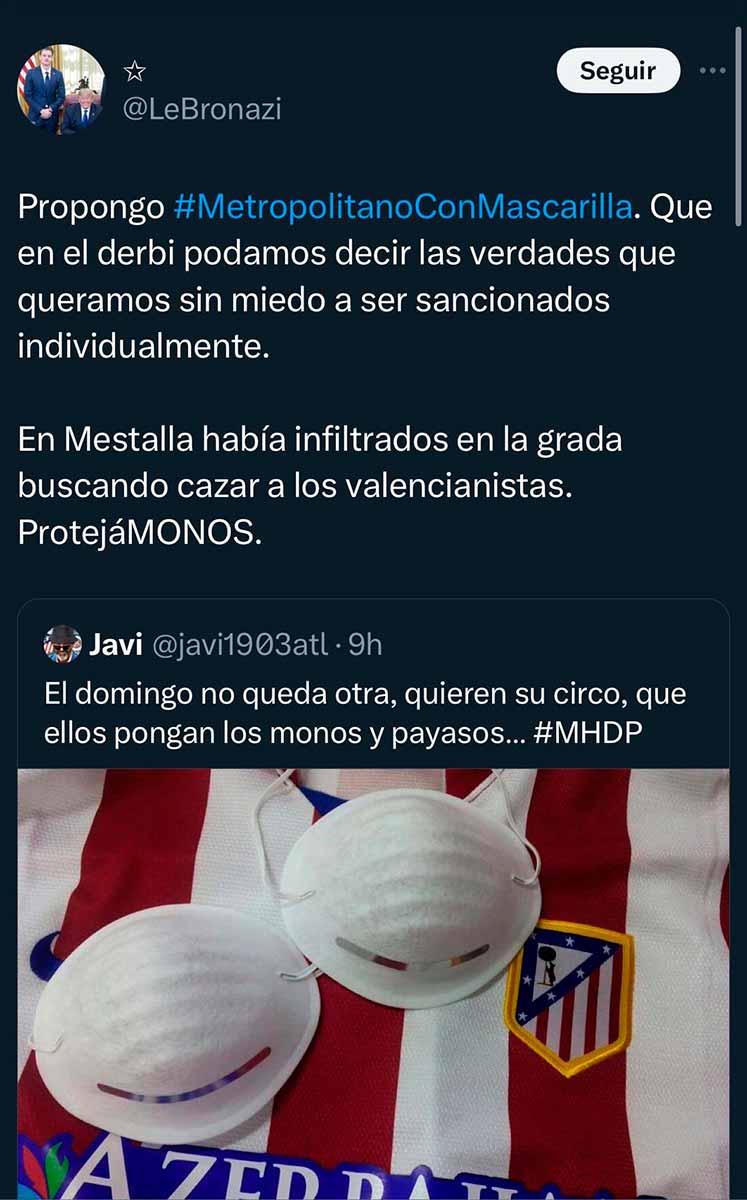 Aficionados que imaginamos vinculados con el Frente Atlético (grupo neonazi que su club auspicia y alienta) están incitando a sus correligionarios a acudir al estadio con mascarillas para poder insultar a Vinícius y proferir cantos racistas sin ser identificados. Por si la cosa no inspiraba suficiente repugnancia y pavor, aluden sarcásticamente a la “viruela del mono”, de la cual se protegerían con las mascarillas en su mente podrida.