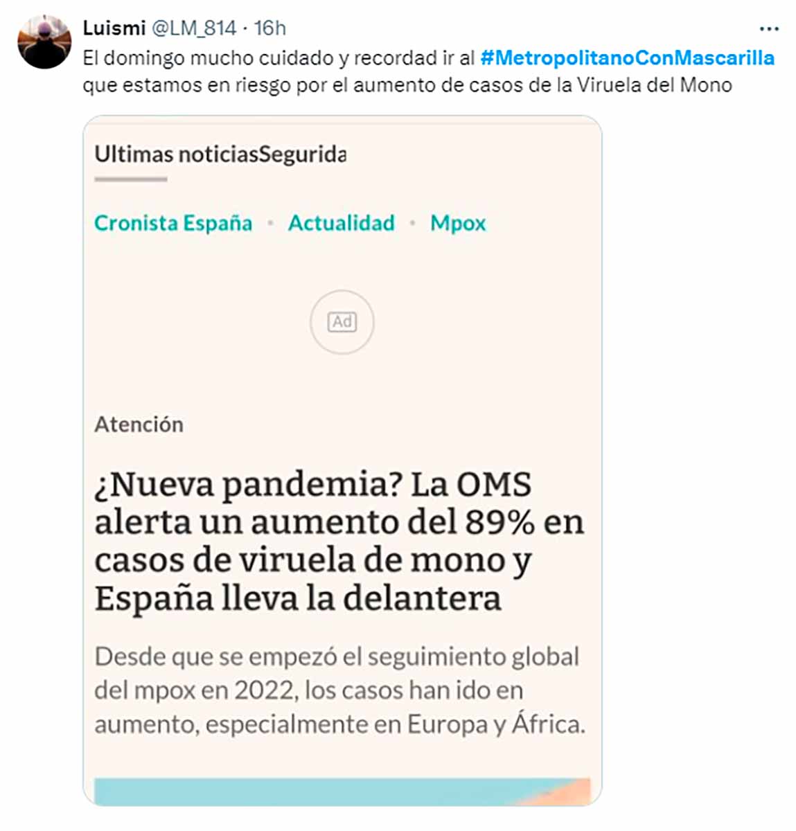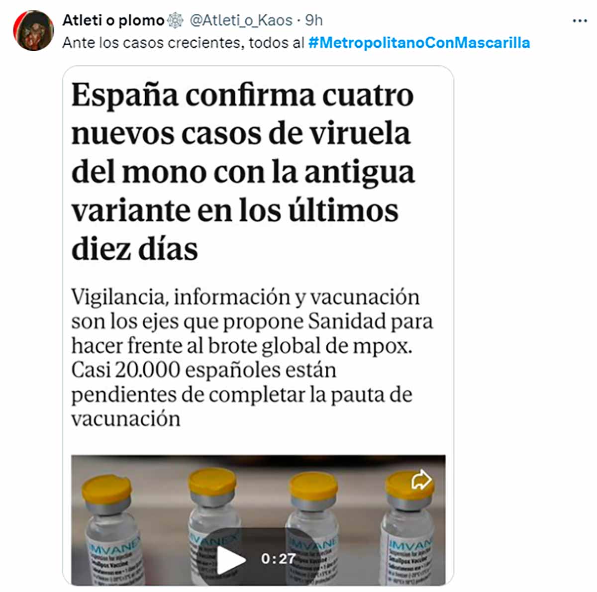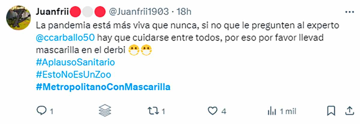 Aficionados que imaginamos vinculados con el Frente Atlético (grupo neonazi que su club auspicia y alienta) están incitando a sus correligionarios a acudir al estadio con mascarillas para poder insultar a Vinícius y proferir cantos racistas sin ser identificados. Por si la cosa no inspiraba suficiente repugnancia y pavor, aluden sarcásticamente a la “viruela del mono”, de la cual se protegerían con las mascarillas en su mente podrida.