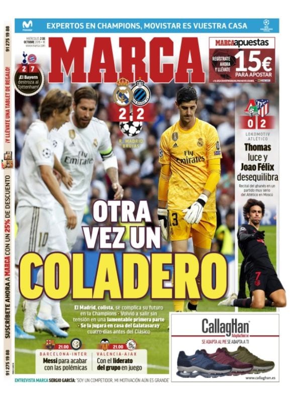 La semi-remontada lograda en la segunda mitad impide que la prensa cargue las tintas contra el Real Madrid. Una derrota hubiera sido catastrófica. No le podemos poner ni un pero a las portadas de los periódicos madrileños. Acierta 'Marca' tildando de coladero lo vivido este martes, aunque los problemas parecen ir mucho más allá de un simple desajuste defensivo. Tampoco 'La Ouija Today' se equivoca con su "alarma", sensación que se ha instalado en el Bernabéu tras un inicio de temporada en el que el número de victorias no es precisamente abundante.