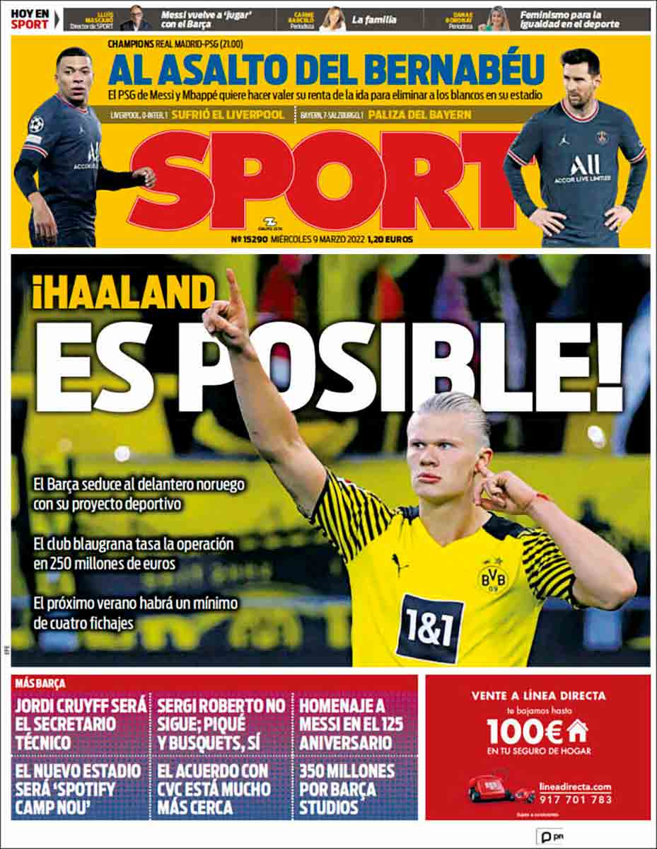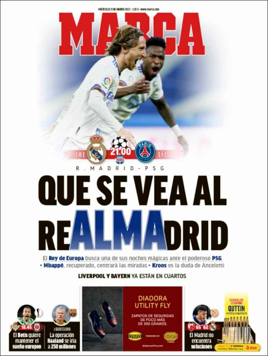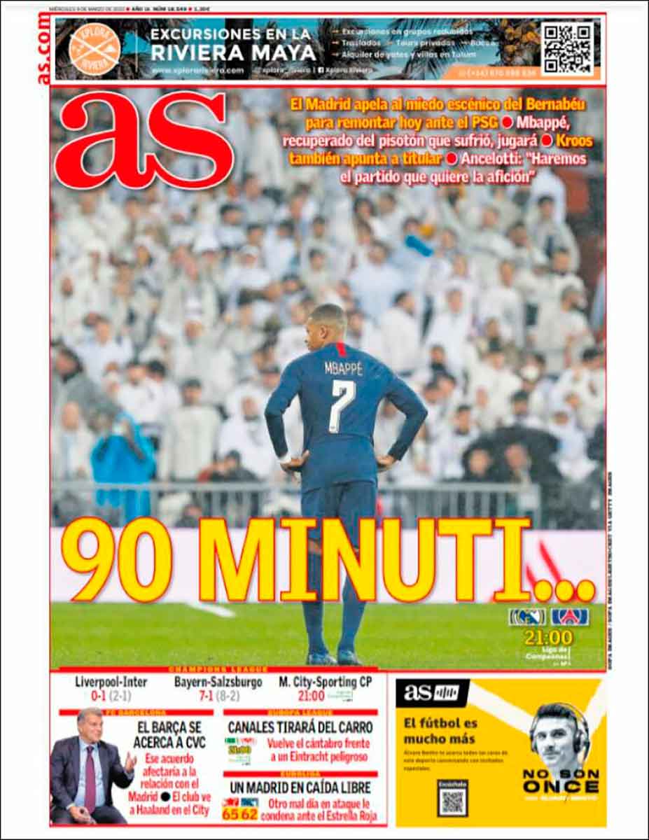 As centra en Mbappé (pronúnciese Bappé) el argumento de su portada. La presunta llegada en verano del esperadísimo nuevo fichaje brinda al partido un morbo especial pero, a pesar del excesivo subrayado de la prensa sobre este particular, lo cierto es que Kylian hoy es un adversario más, uno al que no tiene sentido aplaudir pensando en lo que presuntamente está por venir cuando vista de blanco. Sobre Mbappé hay que ejercer esta noche toda la presión de jugar en el Bernabéu una noche especial, exactamente igual que para cualquiera de sus compañeros. El pisotón sufrido en el entrenamiento de ayer no le va a afectar y será de la partida. Pobrecillo. El ambiente será el de las grandes noches, y toda esa verticalidad ardiente no es cosa fácil de soportar para quien visita el templo blanco en las ocasiones europeamente memorables. El famoso miedo escénico o los famosos “90 minuti” que cita As.