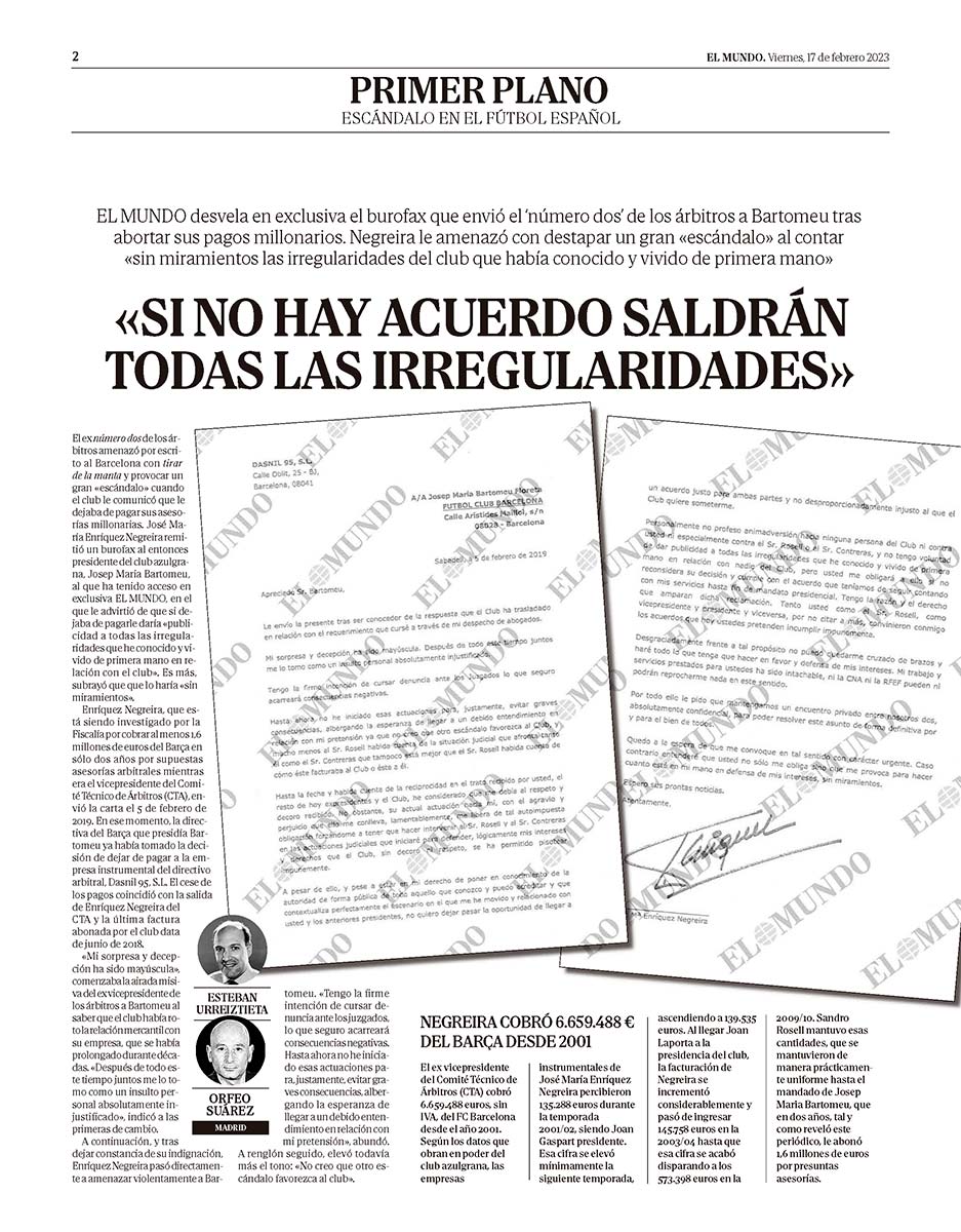 Enríquez Negreira amenazó POR BUROFAX al Barça con revelar la verdad de lo que estaba pasando, y El Mundo nos pone el documento en bandeja. Todo es tan grotesco que la carcajada bufa se topa con la arcada en la garganta, y esta queda bloqueada. La cosa no para aquí y nuevas cosas van saliendo a la luz.