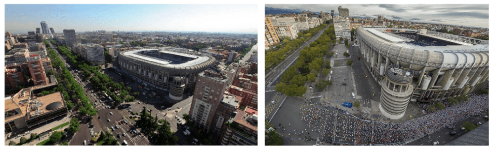 Desde el punto de vista urbano supone toda la mejora sobre el espacio público que el actual no tiene: creación de dos plazas, una paralela a la Castellana (ver imagen 5) y otra en esquina junto a calle Padre Damián (ver imagen 6), apertura de vía peatonal en calle Rafael Salgado y mejora de accesos y de aparcamientos. Estos últimos serán subterráneos y permitirán así aumentar la superficie urbana que se dedica al tránsito peatonal. La plaza principal, que será la que se ubique en la zona del actual centro comercial La Esquina del Bernabéu, será la encargada de gestionar todo el tránsito de lo público a lo privado, de la calle al estadio. El centro comercial será demolido para ganar espacio y abrir al Real Madrid a la ciudad, creándose en este punto la entrada principal al estadio. Una esquina desde la que el Bernabéu pueda contemplarse en todo su esplendor, sin obstáculos. Una lugar desde el que tener una perspectiva completa del templo blanco.