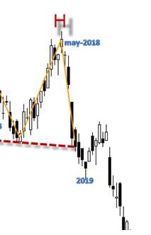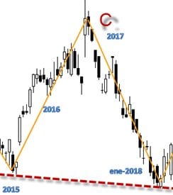Uno de los típicos análisis de bolsa es el que se centra en las gráficas de la acción a medio y largo plazo. Basa sus valoraciones en la figura que dibuja la cotización más que en el propio balance de la compañía. Esta es la figura denominada de modo habitual “hombro-cabeza-hombro” por la forma que dibuja. Muchos picos en el corto, con alzas y bajas, pero que marcan una tendencia en el medio y el largo plazo.