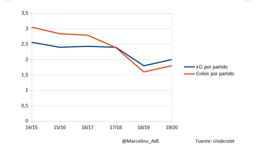 Para muestra, la evolución goleadora del equipo. El desplome es evidente y pese al leve repunte de este curso, el equipo sigue estando muy lejos de la élite.