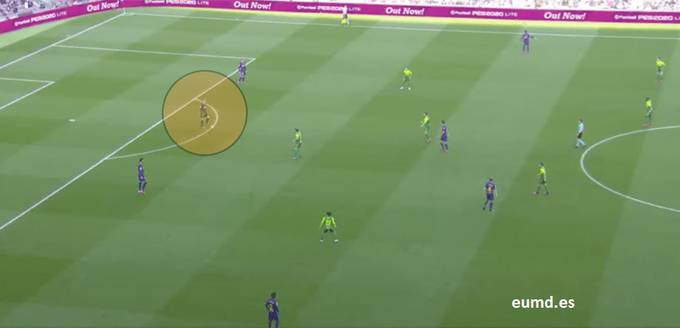 Asimismo, los merengues no encuentran ventajas numéricas en área contraria. Karim Benzema está bastante solo a la hora de atacar a los centrales rivales. Tanto Eden Hazard, como Vinicius Júnior tienen un comportamiento en el campo bien distinto al que tenía Cristiano Ronaldo. Su juego está más enfocado a la generación y el desequilibrio, que a materializar las ocasiones. En este sentido, Vinicius Júnior, quien ha vuelto a ser un activo importante, tiene un comportamiento eminentemente exterior, tratando de ser una fuente permanente de desequilibrio mientras encara a sus pares. De esta forma, cuando Karim Benzema traza movimientos circulares a través de los cuales pretende desordenar la defensa, ningún compañero activa las zonas que Karim habilita. Sólo cuando el Real Madrid hunde por completo al rival y le gira es capaz de encontrar a jugadores desde la segunda línea.