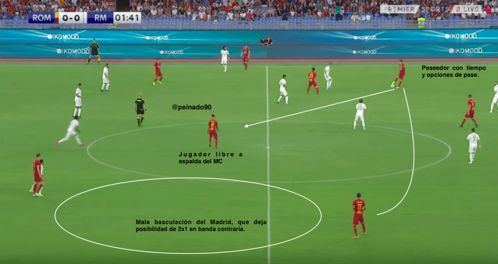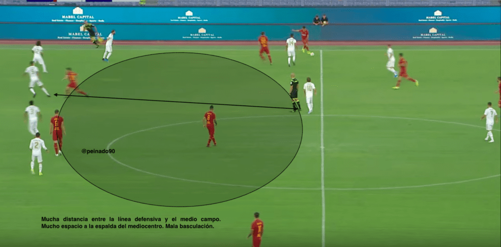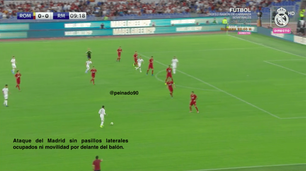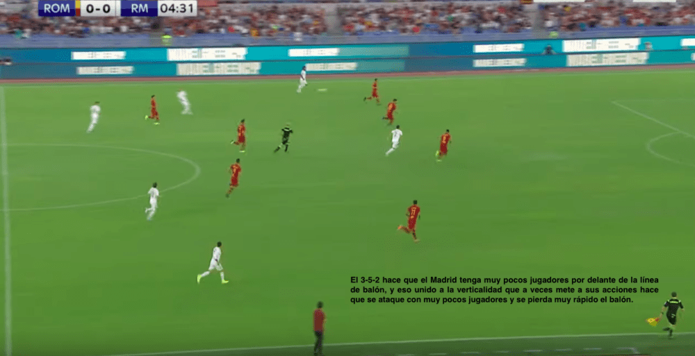 Así llegaron los mejores minutos del cuadro de Zidane, dominando el balón y al rival al conseguir recuperar arriba. El problema venía cuando el equipo no conseguía hacerlo, dando lugar a las otras dos fases: repliegue ante contraataque y defensa posicional. Especialmente caótica ha sido la primera. La falta de pizarra y confianza del Madrid ha hecho que haya sufrido muchísimo cuando el rival salía de esa primera presión o cuando le recuperaba mientras construía su ataque. Ahí hemos visto al Madrid más caótico y desordenado, y también al más falto de confianza, reculando en demasía, separando sus líneas y permitiendo que el rival llegara muy fácil y cómodo al área rival. La Roma, con ataques rápidos evidenció estos problemas, al igual que el de la falta de confianza y compenetración de los tres centrales, pues pese a estar uno contra tres, Dzeko se movió como pez en el agua.