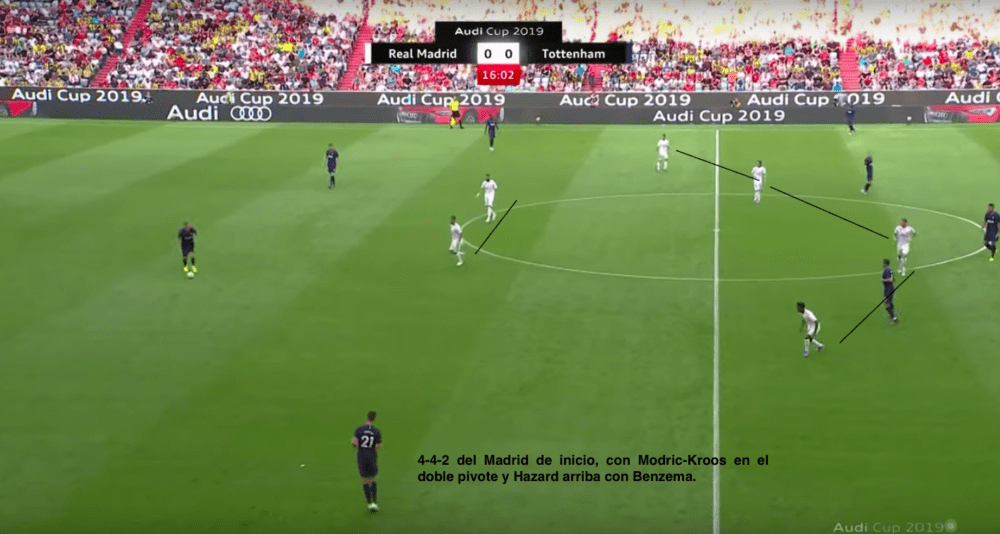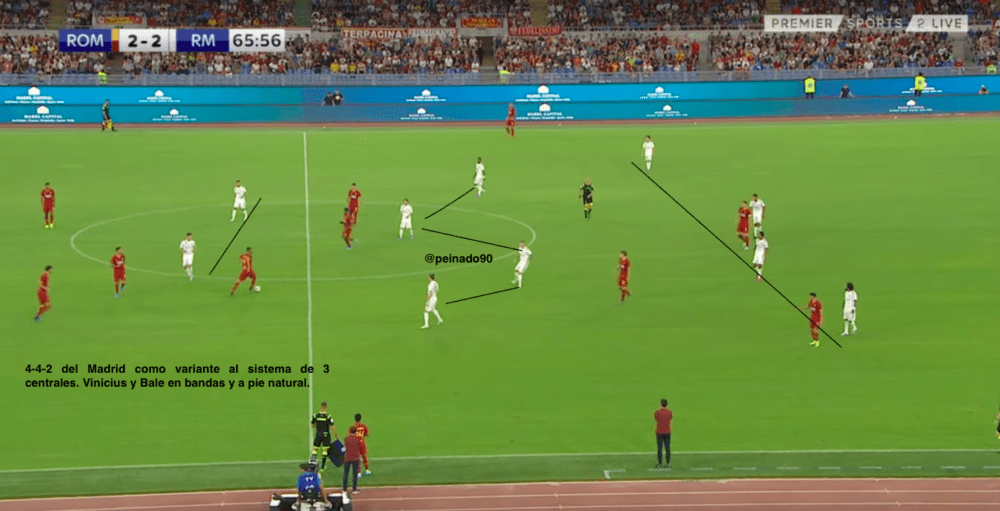En este Madrid 2.0 del técnico se está viendo de inicio un esquema con 3 centrales, que también puede variar, ya sea de inicio o en las segundas partes. Influenciado por los cambios (suelen ser Vinicius y Lucas Vázquez), cuando Zizou quiere sustituir a algunas de sus piezas ofensivas modifica el esquema, pasando a un 4-4-2 con Hazard, Vinicius o Lucas en banda y Benzema, Jovic, Hazard o Isco compartiendo la punta.