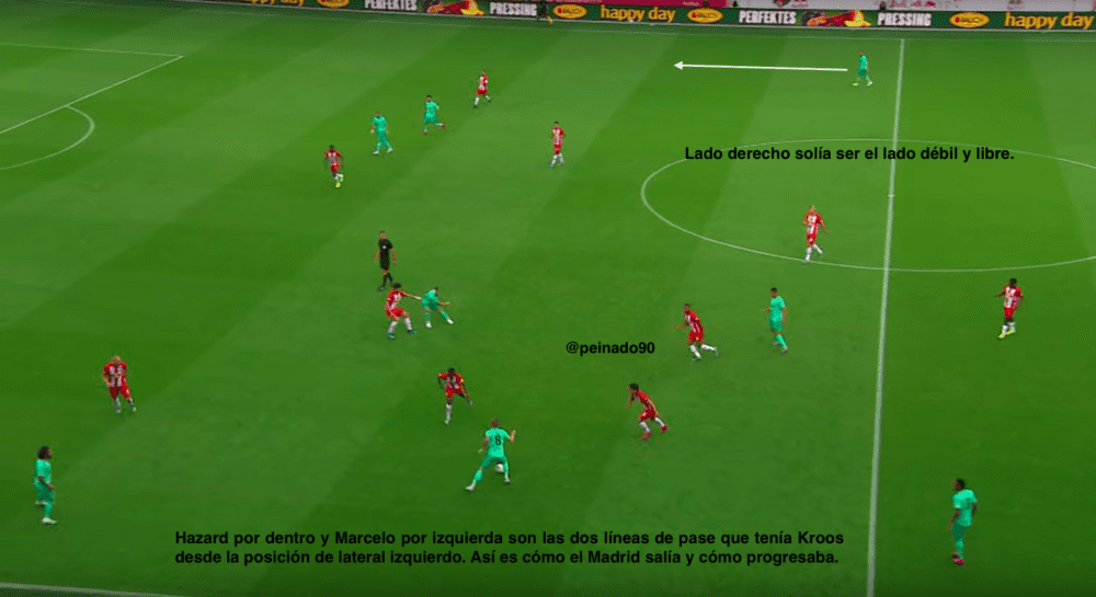 Marcelo por fuera y Hazard por dentro daban dos salidas de pase vertical a Toni y permitían acumular rivales por ese costado, quedando libre la baza del cambio de orientación a la derecha donde Carvajal tendría espacio (que no podría aprovechar, ya que nunca estaba en superioridadal, al no haber extremo por ese lado).
