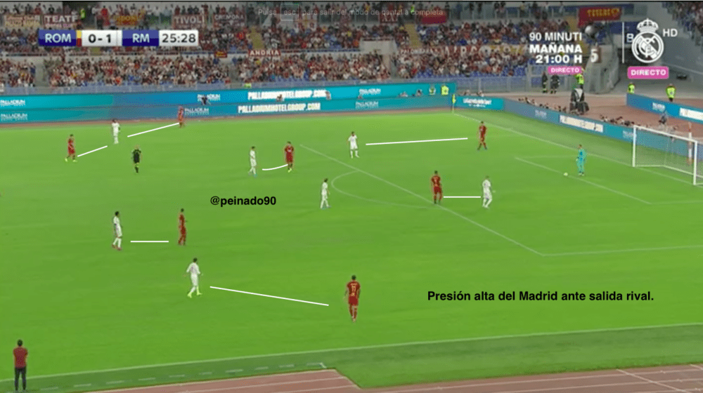 Podemos diferenciar tres fases defensivas, de las cuales el Madrid solo ha estado cómodo en una de ellas. Esta ha sido su defensa hacia delante, presionando rápidamente tras pérdida o presionando arriba cuando el rival trataba de salir en corto.