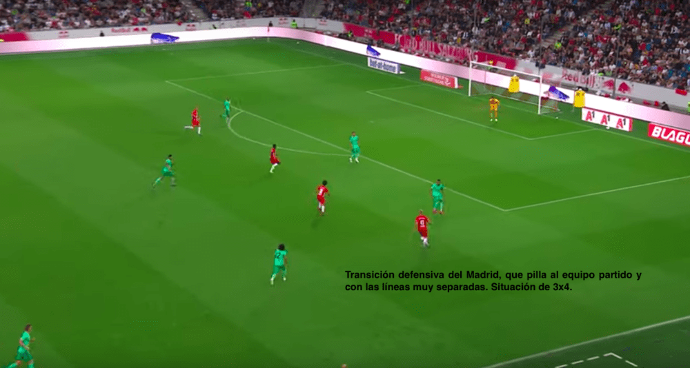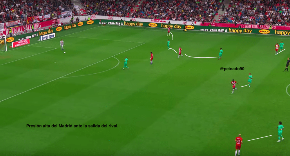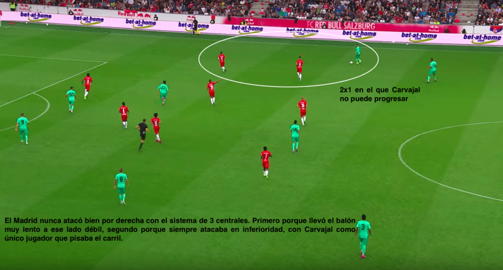 Durante la primera parte el Madrid fue superior a su rival, sobre todo gracias a una superioridad 3x2 en salida de balón con los tres centrales que hacía superar fácilmente el primer escalón y encontrar a Kroos abierto a la izquierda, lateralizando su posición para recibir en el lado de Marcelo y Hazard. Esta es una de las principales ventajas de salir con línea de tres atrás, que normalmente se tiene superioridad en salida. Sin embargo, el Salzburgo ajustó muy bien en la segunda parte, dificultando dicha tarea y dejando en evidencia los problemas de Casemiro al recibir de espaldas y presionado.