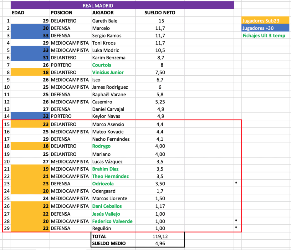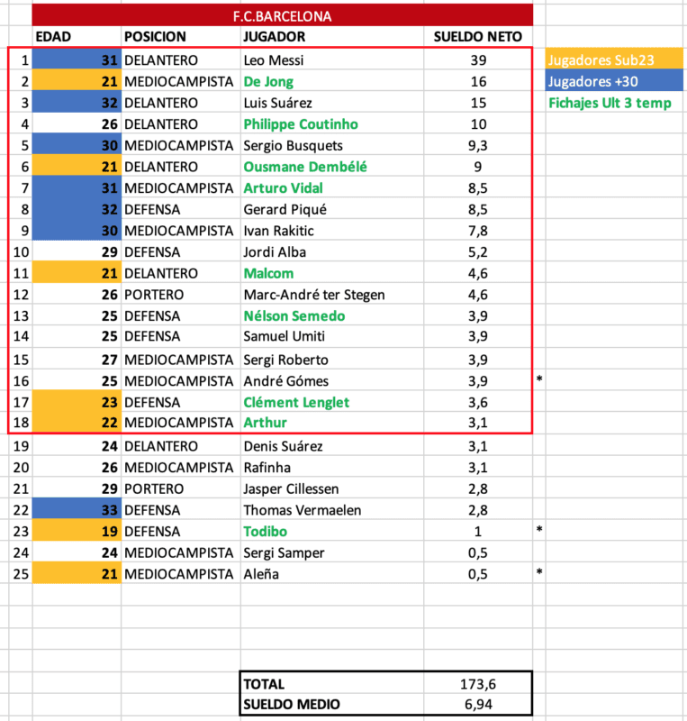 Dentro del listado (ordenado de mayor a menor sueldo), me ha parecido oportuno señalar con azul a aquellos jugadores con 30 o más años, así como señalar en color amarillo a los jugadores sub 23. Y de igual manera, aparecen en verde los jugadores fichados en las 3 últimas temporadas, incluyendo ya los fichajes de la temporada 19/20 y algunas vueltas de cesión.