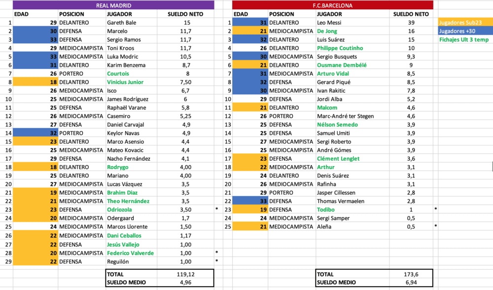 El análisis de los datos refleja datos muy reveladores e interesantes. En primer lugar, el sueldo total es significativamente más alto en el F. C. Barcelona (173) con respecto al Real Madrid (119). En ambos casos estas cifras no tienen relación alguna con la declarado como masa salarial total. Los 562 frente a los probables 400/420 del Real Madrid. Esto se debe a varios factores. En primer lugar, el sueldo que aparece en la tabla es neto, faltarían además conceptos como primas, premios o variables, así como salarios de otros miembros de la plantilla y amortizaciones. No olvidemos que, por ejemplo, entrenadores como Simeone cobran 50 millones de euros brutos. Cantidades significativas que afectan sin duda al presupuesto.