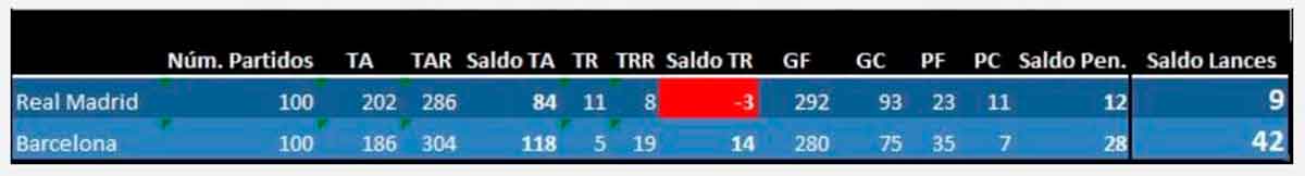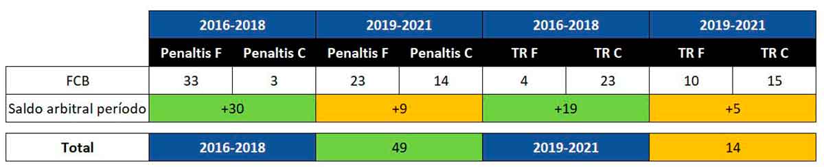 —Bueno, en el período 2016-2018, el Barça sufre solo 4 expulsiones, mientras que a sus rivales los expulsan hasta 23 veces. Y en el segundo período analizado, la diferencia es mucho menos llamativa, 10 tarjetas rojas propias, frente a 15 de los rivales.