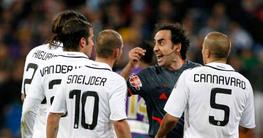 —Totalmente, totalmente —el sudor sobre la frente caía de manera incontrolable y empezó con un temblor en las piernas—. Totalmente. Yo mismo sentí la presión directamente de Florentino Pérez al acabar un partido en que pité al Real Madrid. Acaba el partido, 6—1 al Deportivo, salimos del campo, los asistentes salen conmigo y trata de encerrarme en un cuarto. Le pregunto si me está haciendo una broma y le digo que se ha acabado la conversación. A la media hora ya lo sabía el Comité Técnico de Árbitros. Lo puse en conocimiento, me parecía muy grave, pero ahí quedó. Para que vean lo que es presionar. No me voy a esconder. No hay ningún árbitro corrupto, porque nosotros estamos por encima.