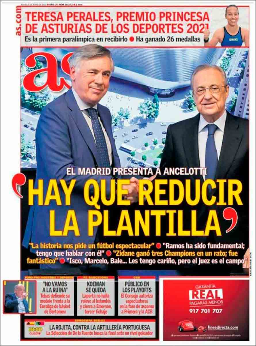“Hay que reducir la plantilla”, titula As con acierto, pues por encima de halagos cosméticos a jugadores que lo fueron todo con él pareció clara la voluntad de asumir la necesidad de limpia. (Y, si no es así, tenemos un serio problema). El Madrid tendrá que hacer encaje de bolillos para hacer realidad la perentoria salida de jugadores que lo han sido todo pero desgraciadamente no pueden seguir con el refuerzo de la plantilla sin incurrir en locuras que desestabilicen al club.