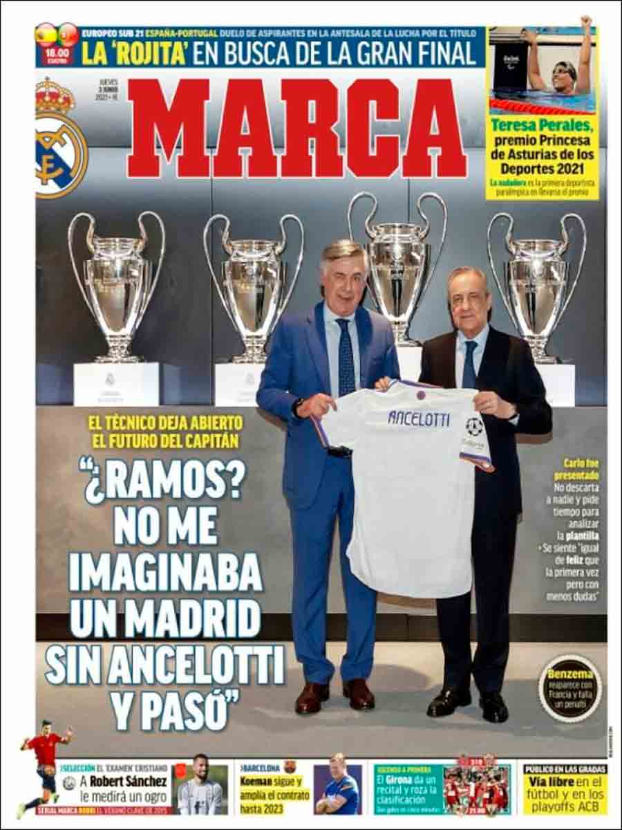 Buenos días. “¿Ramos? No me imaginaba un Madrid sin Ancelotti y pasó”. Este es el titular de Marca. Indefectiblemente, al leerlo hemos pensado: ¿Ancelotti? No nos imaginábamos ahora un Madrid con Ancelotti y pasó. Sí, amics, antes de ayer era un recuerdo, ayer una realidad y hoy un hecho.
