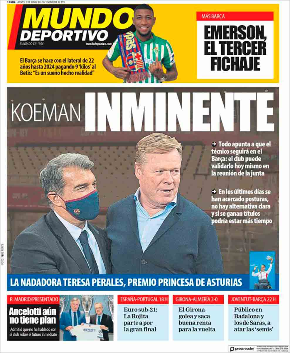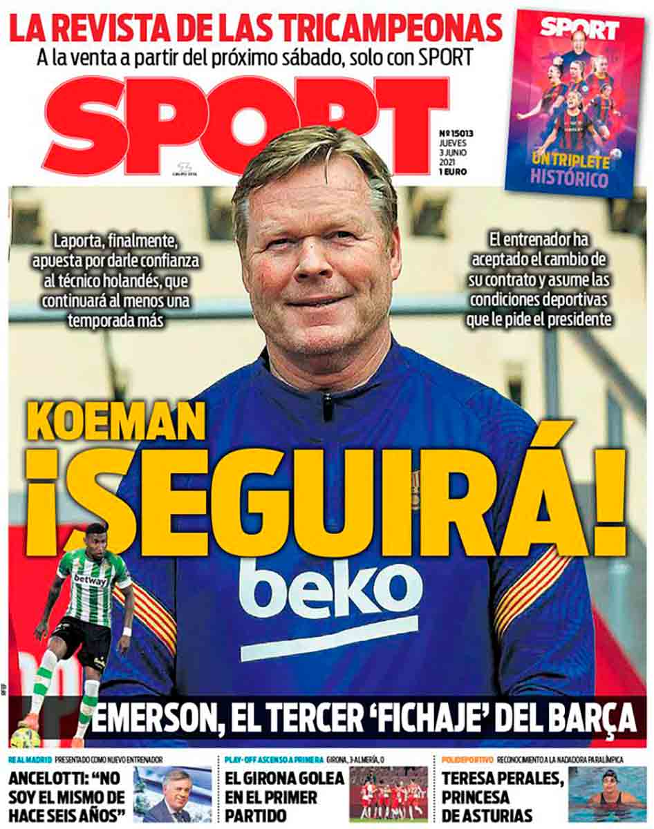 En cambio, Sport sí muestra coherencia temporal y titula: “Koeman ¡seguirá!”. Nos alegramos de que al menos respeten las normas que impone el tiempo, ya que las de la educación, el respeto y la decencia las incumplen de manera habitual (por más tiempo que pase, seguimos sintiendo un profundo desprecio por el acoso familiar al que sometieron a Martínez Munuera).