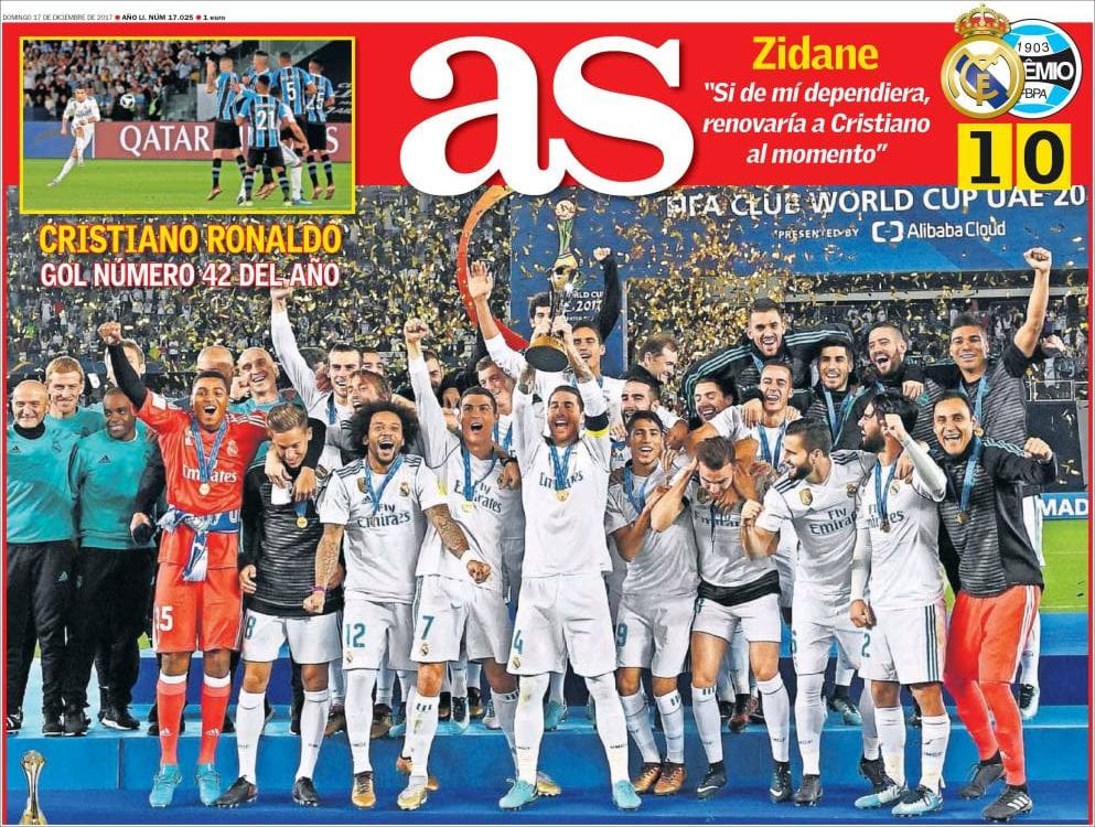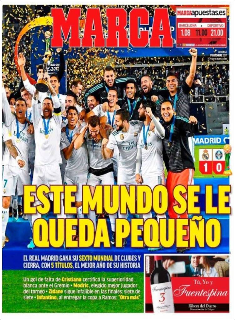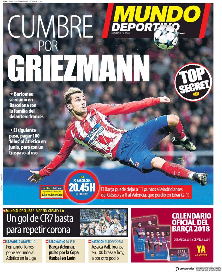 El bellerín de Mundo Deportivo a cuenta del Mundial de Clubes logrado por el Madrid es Griezmann, quedando la conquista del Madrid para un recuadro inferior en negro. Al menos, a diferencia del de Sport, no es un recuadro en negro que incida en el "error" del Gremio para explicar el insignificante triunfo blanco, como hace Sport. No. Valverde, aquí, ha dado el OK a Bellerín sin restar excesivos méritos al asunto, lo que es de agradecer.