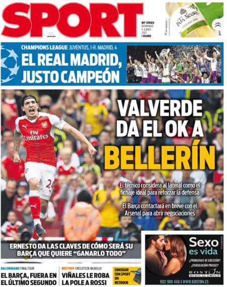 Buenos días, Campeones del Mundo. La portada con que hoy inauguramos esta sección no es de hoy, sino del pasado 4 de junio. El Madrid acababa de proclamarse Campeón de Europa en Cardiff y nuestros ínclitos amigos del diario Sport, en el afán por minimizar la trascendencia del hecho, le daban el grueso de su portada a la presunta luz verde de Valverde al fichaje por el Barça del lateral Bellerín. Jesús Bengoechea y sus compañeros de gloria madridista en Cardiff, entre ellos algún galernauta, respondieron a la histórica portada de Sport con un cántico preñado de euforia (¿y alguna mala leche?).