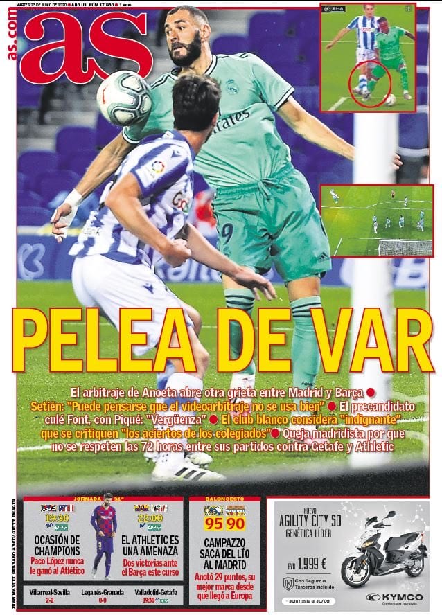Para compensar la imparcialidad de las fotografías, titulan «Pelea de VAR» y dan pábulo al sofoco de Setién, Piqué y Font, dejando para el final el pequeño detalle de que al Madrid no se le van a respetar las 72 horas de descanso entre los partidos contra Getafe y Athletic. Para un hecho matemático e indiscutible al que aferrarse, optan por restarle importancia. Muy elocuente.