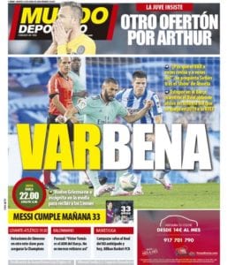 Tras la llorera de ayer, en la que el Mundo Deportivo llegó a privarse en algunos momentos siendo necesarios unos golpecitos en la espalda, han quedado en ese estado apático que sucede a un ataque de ansiedad y no han sido capaces ni de realizar un mal juego de palabras; «VARBENA». Trabájenselo un poco más, que parecen varones varados que se van de vareta por el varapalo contra el Sevilla. El resto de la portada carece de la misma indolencia que el titular.