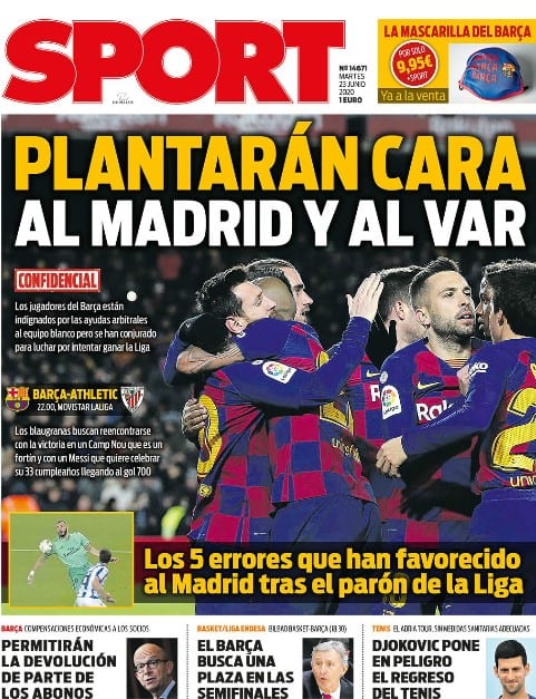 El diario Sport continúa con el berrinche y asegura que los jugadores blaugranas plantarán cara al Madrid y al VAR. Ilustran el titular precisamente con lo que parece una pelea de bar; ante la falta de rivales, el siempre comedido Jordi Alba da la impresión de encararse con un compañero mientras Messi recibe el abrazo del oso de un posible pandillero. El argentino pide auxilio y se aprecia con claridad que viene a socorrerle una mano negra. Ahora entendemos por qué la mano negra no actuó contra el Real Madrid en Anoeta, porque estaba salvando a Messi de la asfixia. Gracias, Vidal.