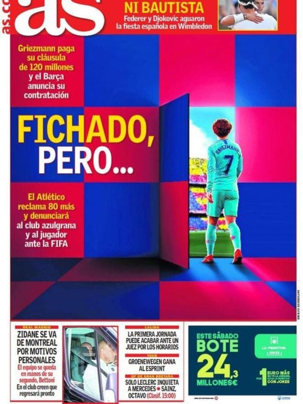 La portada de 'La Ouija Today' es brillante. De hecho, puede ser de las mejores de los últimos años. No era difícil, ya que el listón que dejó Relaño se superaba con un Paint algo curioso, pero, siendo honestos, se trata de una primera página que sabe captar el escenario en el que nos encontramos y en la que las palabras no restan protagonismo a una gran imagen. Se limita a contar que Griezmann ya es del Barcelona, pero que el Atlético de Madrid denunciará. Una nueva forma de trabajar era posible. Veremos si con el Real Madrid se muestran igual de tibios.