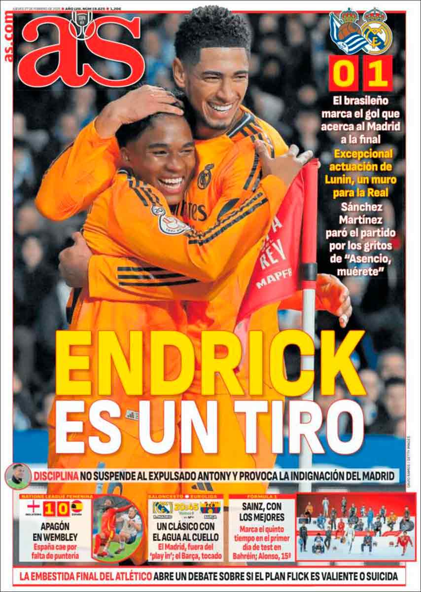 Buenos días, amigos. El Real Madrid tiene un pie en la final de la Copa del Rey tras derrotar anoche (por poco no podemos decir “hoy mismo”, con estos horarios) a la Real Sociedad. Fue por 0-1, y el tanto lo marcó ese obstinado del gol de muslos inabarcables que responde al nombre de Endrick.