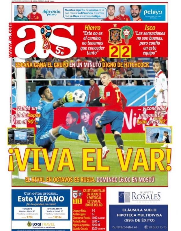 Buenos días. La selección española va de mal en peor pese a que ayer se metió en octavos de final como primera de grupo. Lo hizo de aquella manera, con un minuto loco, mucho VAR y una flor -no la de Zidane, sino otra-.