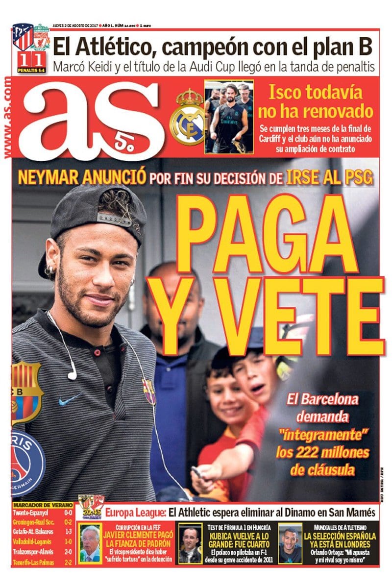 En el ángulo inferior izquierdo, Marca nos recuerda, respecto a que el PSG pagaría la cláusula, que ellos "ya lo habían avisado", autocolgándose medallita al mérito.