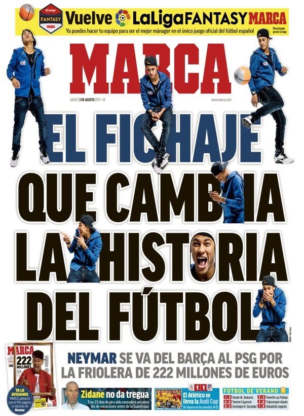 Sí. Neymar ha anunciado a sus compañeros que dejará de pertenecer al ejército desarmado de Cataluña sin perjuicio (imaginamos) de que la causa independentista siga mal que bien su curso sin su inestimable colaboración. El Barça ha reaccionado públicamente remitiéndose al importe de la cláusula 24 horas después de que Tebas saliera a defender a los culés indicando que de la cláusula nada ("No me defiendas, por favor", le decían en los 70 al gran Benito los delanteros rivales). Por su parte, Marca ha reaccionado a esa reacción, como veis, dando por hecho que ese será finalmente el importe que desembolse el jeque, si bien de hecho nos parece que es precisamente el PSG quien ahora mismo tiene la verdadera potestad de marcar los tiempos y las cantidades. ¿Se aviene el Barça a rebajar dicho importe por debajo de la cláusula, o corre el riesgo de acabar quedándose con Neymar a 31 de agosto si el club francés persiste en un eventual órdago? El Barça tiene prisa por concretar la venta para tener a su vez tiempo de moverse en un mercado que le recibirá con una sonrisa maléfica. El PSG no tiene prisa alguna.