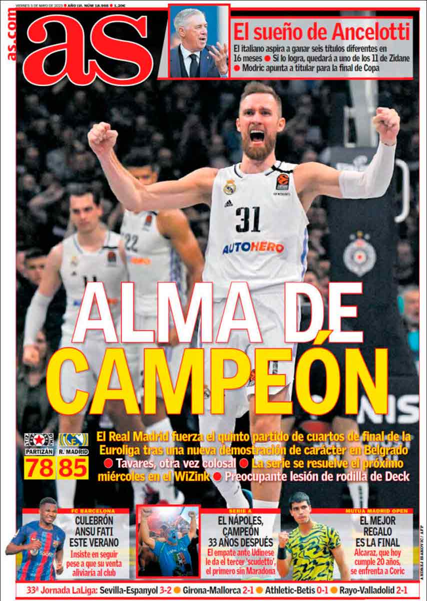 Marca opta por la Final de Copa de mañana sábado como argumento principal, y también nos parece bien. La Copa no es el torneo más importante del año pero, como nos recuerda aquí Israel García Montejo, es el torneo del aquí y del ahora y puede ser el gran título del año. Además, el Madrid engrandece las competiciones que juega, las llena y dignifica con su sola presencia, aunque suene solemne o arrogante. Si se impone mañana en La Cartuja, el Madrid ganará un gran título porque será una competición que jugó el Madrid. La cosa es así de autorreferencial, y si además se tiene en cuenta el memorable camino seguido por el equipo blanco para llegar a Sevilla —con remontadas memorables ante Villarreal, Atleti y Barça— es una Copa que apetece ganar. Y mucho.
